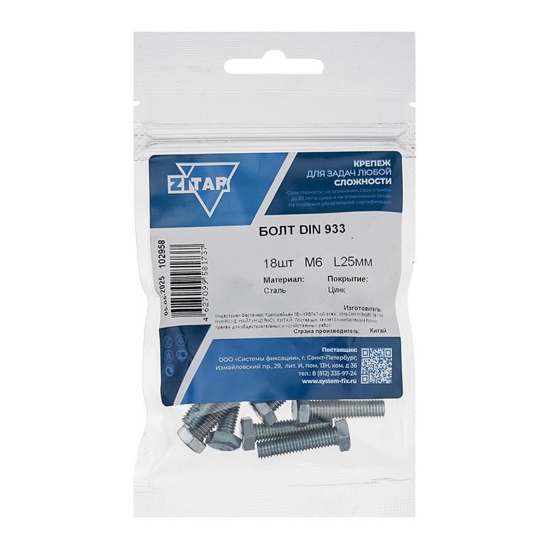 Болт с шестигранной головкой М6х25 DIN 933 класс прочн. 8.8 оцинк. (пакет) (уп.18шт) Tech-Krep/Zitar 102958