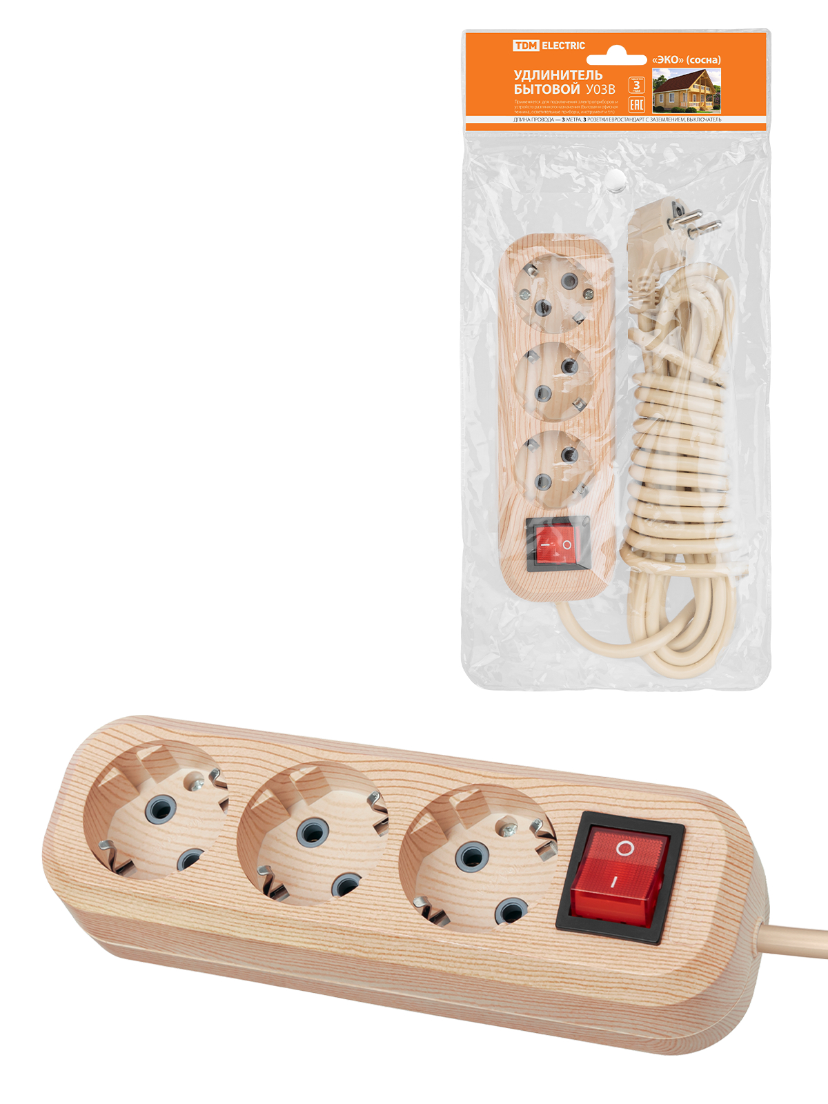 Удлинитель бытовой У03В (выключатель, 3 гнезда, 3 метра, 2П+3, ПВС 3х1мм) 16А/250В TDM SQ1303-2101 |